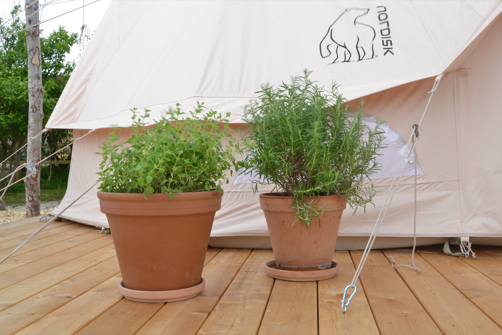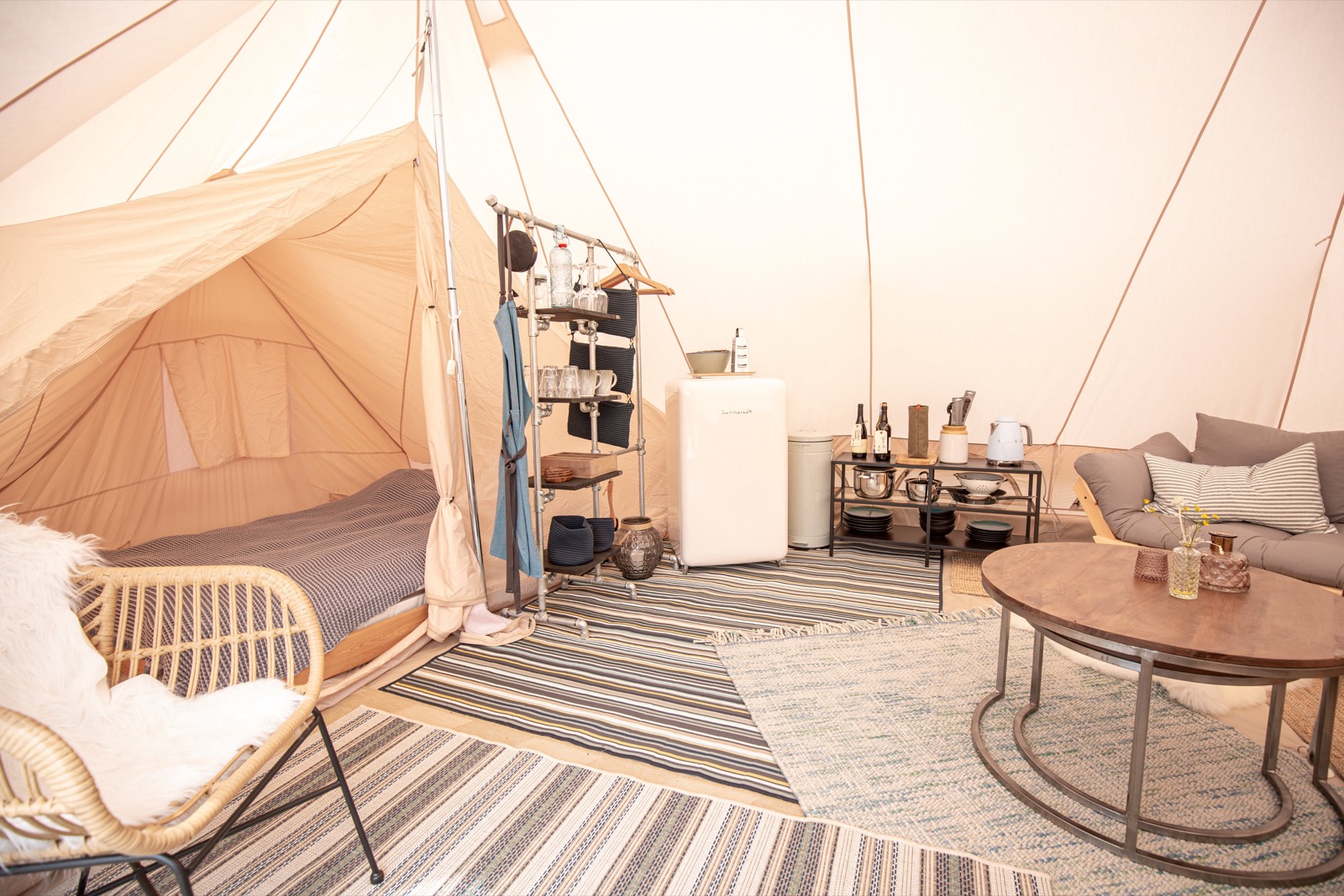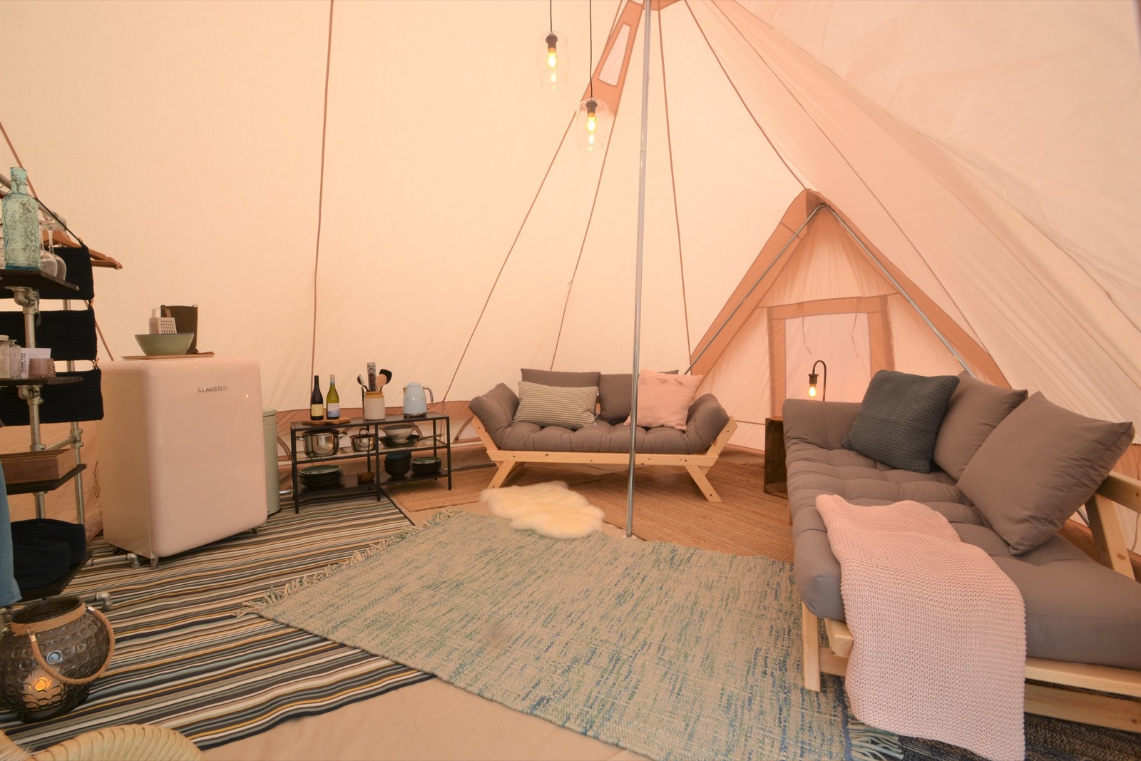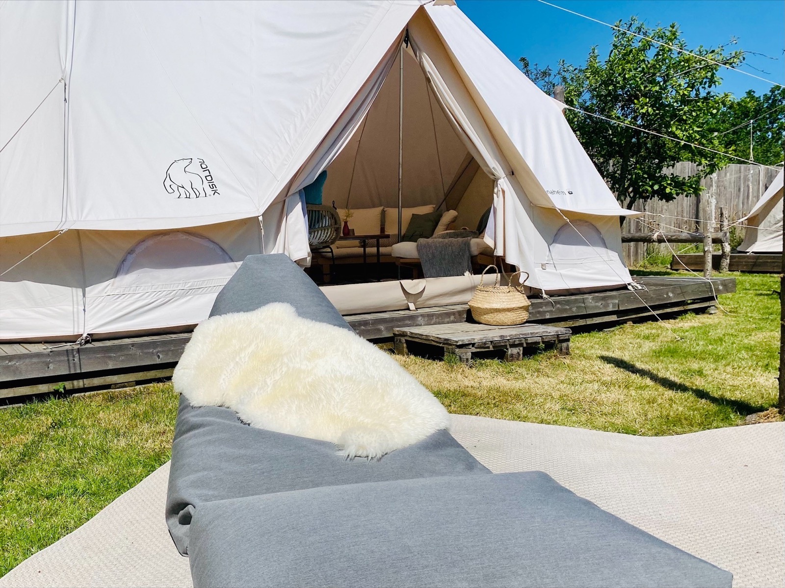 Teltene er 24 m2, med højt til loftet. Vi har gjort det super hyggeligt med tæpper og puder, lanterne og lamper. De er komfortabelt indrettet med sovepladser til 2 voksne og 2 børn, køleskab og det mest nødvendige køkkenservice. Hvert telt står på en fast bund, hævet over jorden med havemøbler og grill udenfor.